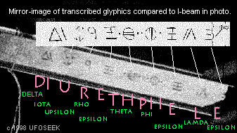 The graphic shown above is a comparison of the transcibed image (strip across top of image) with the orginal photo. It is a high contrast enhancement to bring out the inscriptions more clearly. The glyphs are actually reversed. The normal photo shows someone holding the I-beam in his hands. When you compare the transcribed symbols with the inscriptions you will see that they correspond exactly! But what is wrong with this picture? The glyphics in the photo are "inside out!" The I-beam is being held wrong side forward. The embossed symbols must also appear on the other side of the I-beam material which was described by the sheep rancher, Mac Brazel, as being lightweight. You will also notice that the I-beam is broken in the lower right corner section. The Greek letter "Epsilon" is in this position. The correct sequence, left to right, is ELEPHTHERUID.